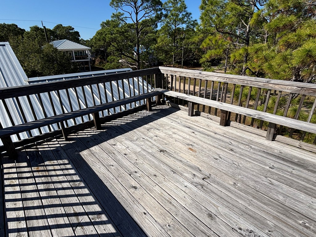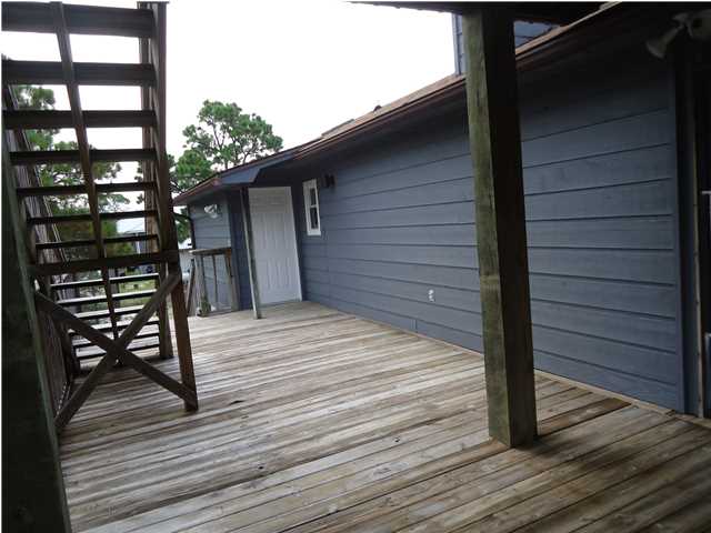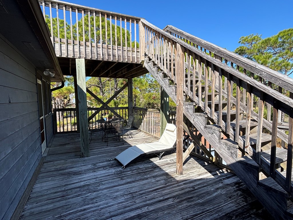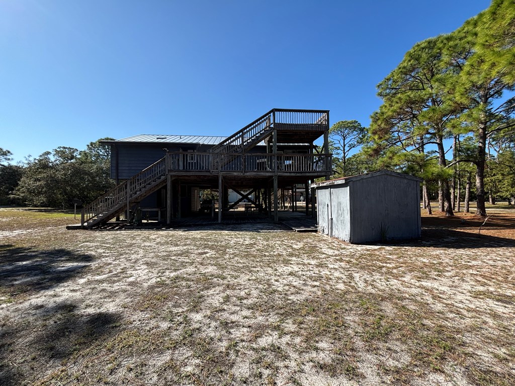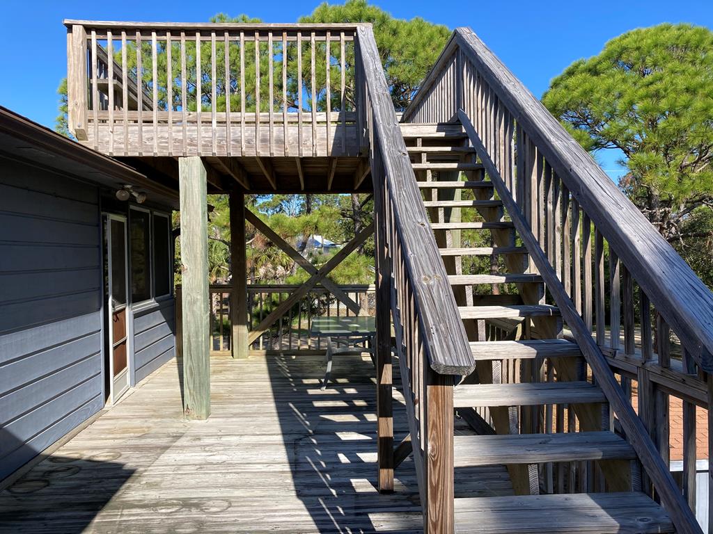 Corner Lot with mature Pines and Bottle Brush trees. Short walk to the beach or bay. This coastal getaway has decks and more decks for entertaining and viewing. Airy and spacious with skylights in the 2 bedrooms upstairs. Kitchen appliances; flooring; granite counter tops with fixtures; bathtub with tile surrounds; all completed in July 2016-2024. 1/2 bath and downstairs bdrm. also renovated. Inside repainted. House has GREAT BONES! Spacious great room leads out onto a screened porch. New railings on E Sawyer side of house. NEW standing seam roof. Plenty of parking for your boat, cars, trucks, golf cart... Outdoor shower - hot and cold water. City water & septic. Well may be resurrected for landscaping usage. Extend the three attached exterior storage units into the interior living areas expanding the upstairs and downstairs living spaces, if desired. WONDERFUL ISLAND GETAWAY. NO HOA. Has not been rented since July of 2024. Centrally Located. Quiet neighborhood. Move in ready. Turnkey