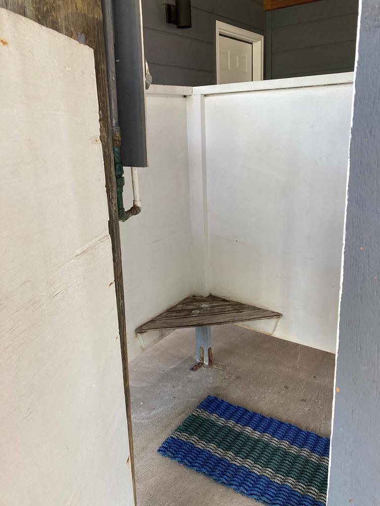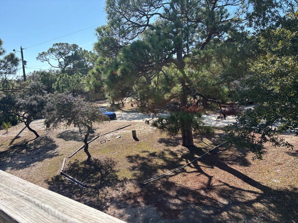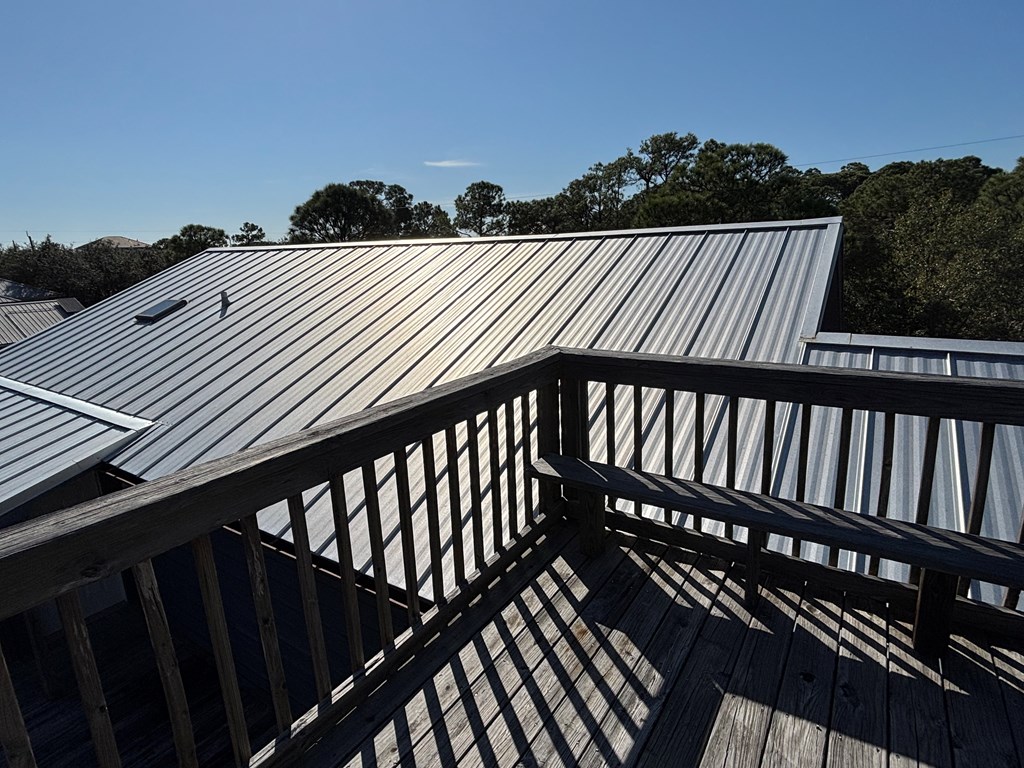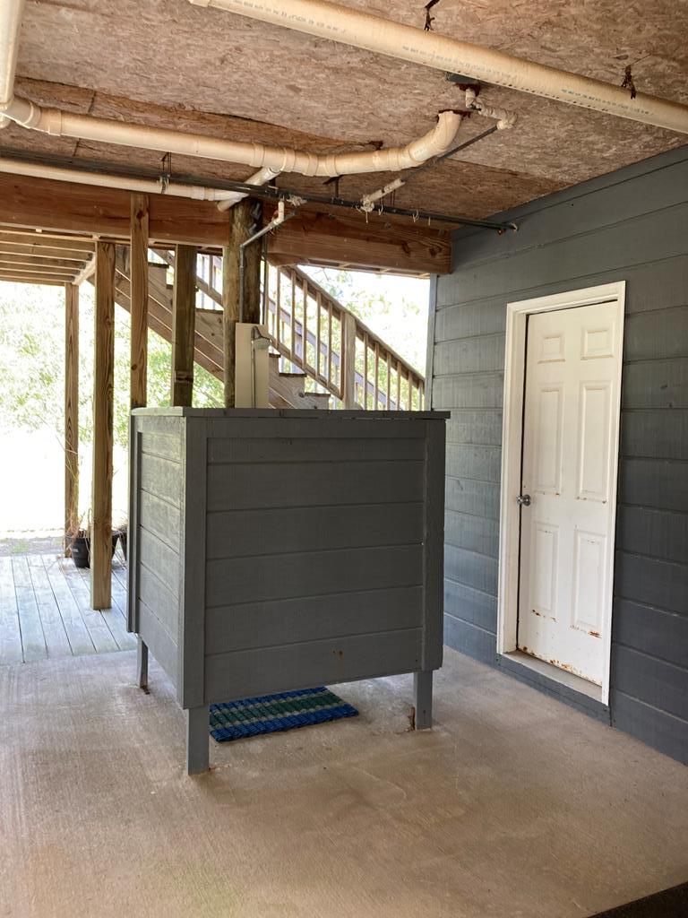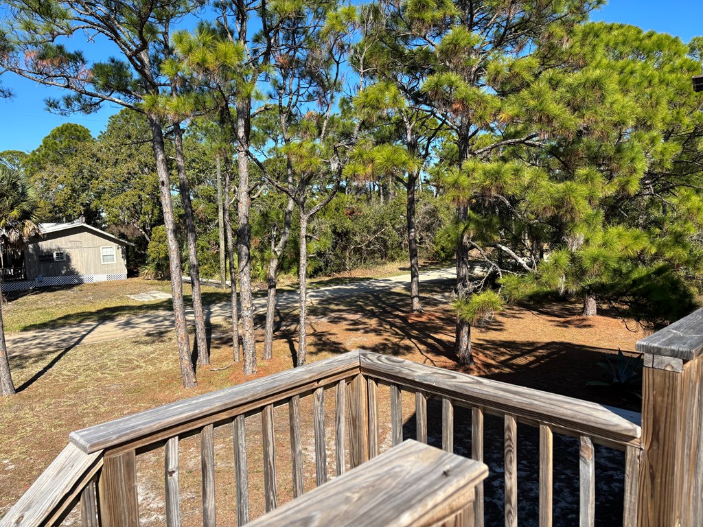 Corner Lot with mature Pines and Bottle Brush trees. Short walk to the beach or bay. This coastal getaway has decks and more decks for entertaining and viewing. Airy and spacious with skylights in the 2 bedrooms upstairs. Kitchen appliances; flooring; granite counter tops with fixtures; bathtub with tile surrounds; all completed in July 2016-2024. 1/2 bath and downstairs bdrm. also renovated. Inside repainted. House has GREAT BONES! Spacious great room leads out onto a screened porch. New railings on E Sawyer side of house. NEW standing seam roof. Plenty of parking for your boat, cars, trucks, golf cart... Outdoor shower - hot and cold water. City water & septic. Well may be resurrected for landscaping usage. Extend the three attached exterior storage units into the interior living areas expanding the upstairs and downstairs living spaces, if desired. WONDERFUL ISLAND GETAWAY. NO HOA. Has not been rented since July of 2024. Centrally Located. Quiet neighborhood. Move in ready. Turnkey