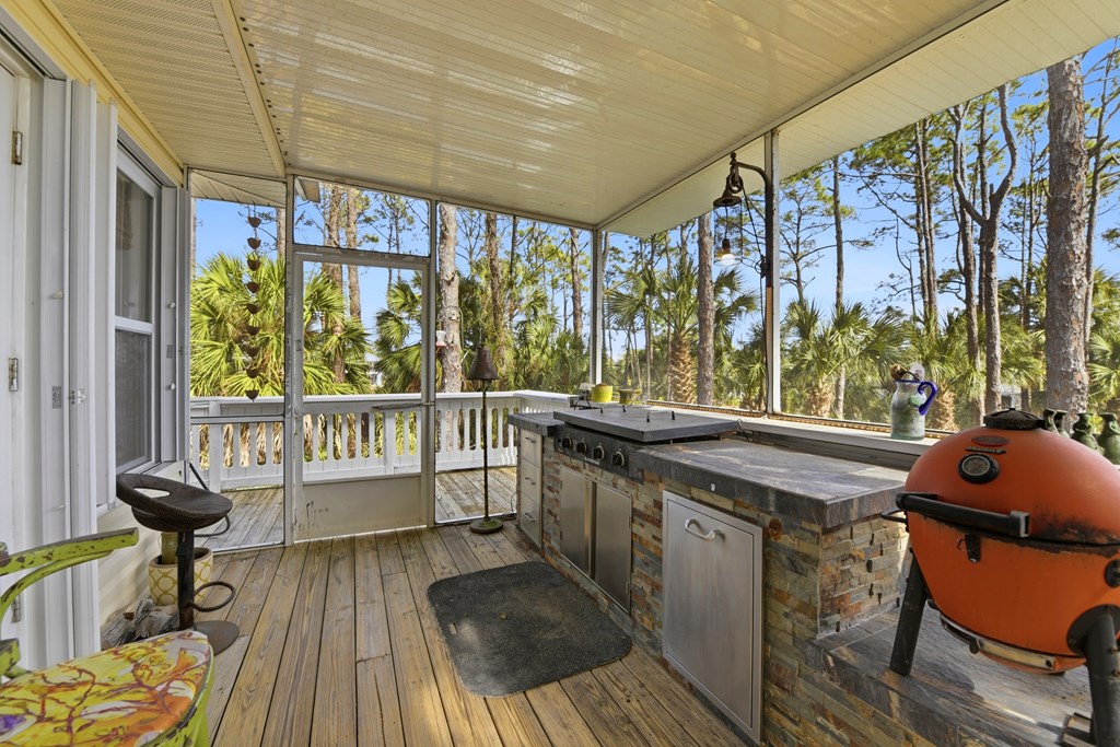 Custom designed home located in a quiet residential area of St. George Island, yet just minutes from the Island's center for shopping, dining, and the iconic St. George Island Lighthouse Park. This inviting home features a covered entry leading into an open-concept living room and kitchen with vaulted ceilings and ceramic tile flooring. The spacious covered deck includes a cook station—perfect for entertaining or relaxing coastal evenings. The primary suite opens directly to the deck and offers a walk-in closet, double-sink vanity, wiring for a TV, and a spa-like bath complete with a garden tub and shower. Two guest bedrooms share a full bath, providing comfortable accommodations for family or visitors. The ground level offers abundant flexible space ideal for storage, a studio, game room, or garage. Outdoors, enjoy a private deck, an outside shower, and a charming “she shed” perfect for gardening or hobbies. Additional features include: Storm shutters CARGO lift Irrigation well on a 3-zone timer system Gulf views from the widow's walk A thoughtfully designed Island retreat offering comfort, functionality, and coastal charm in a peaceful yet convenient location. Roof replaced 2023; HVAC replaced 2022