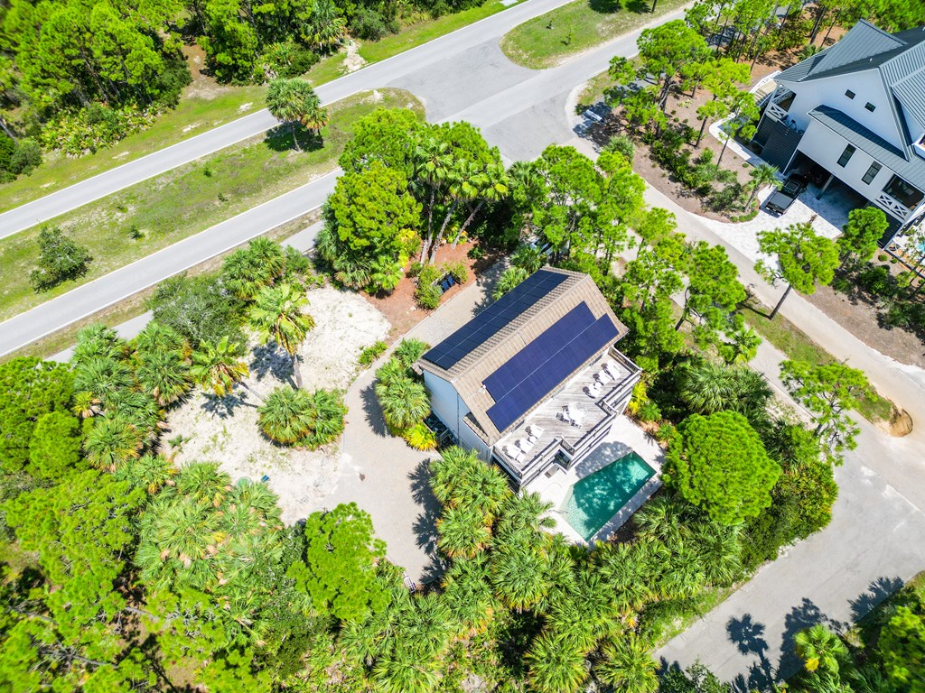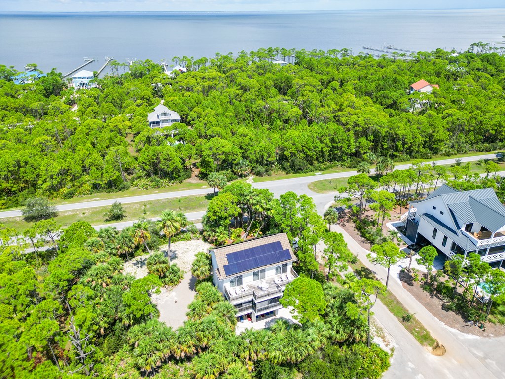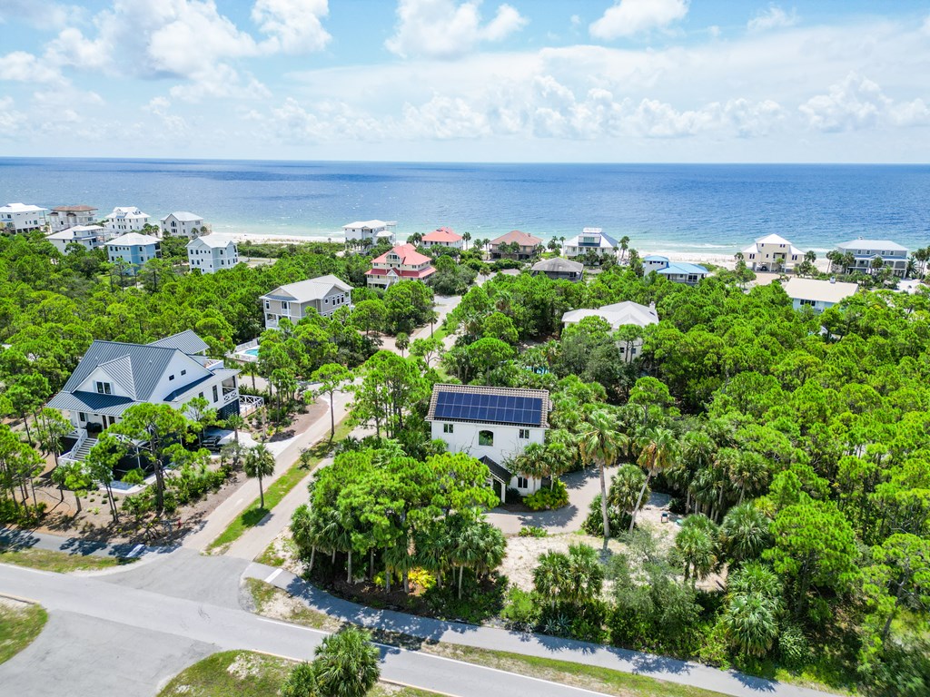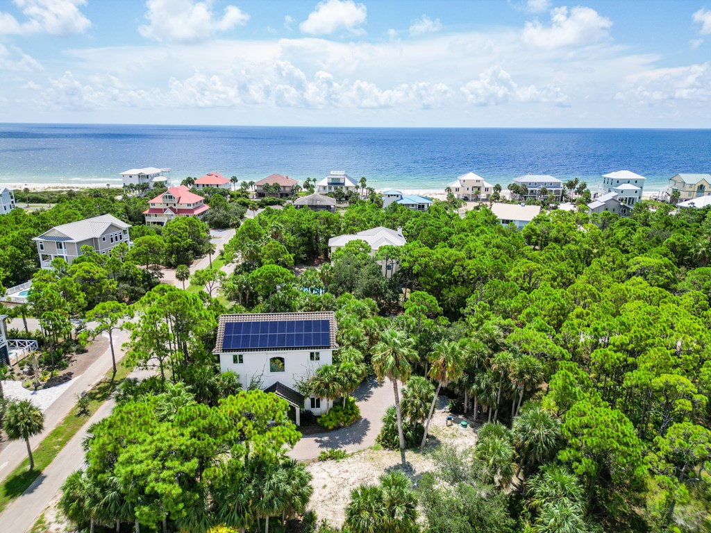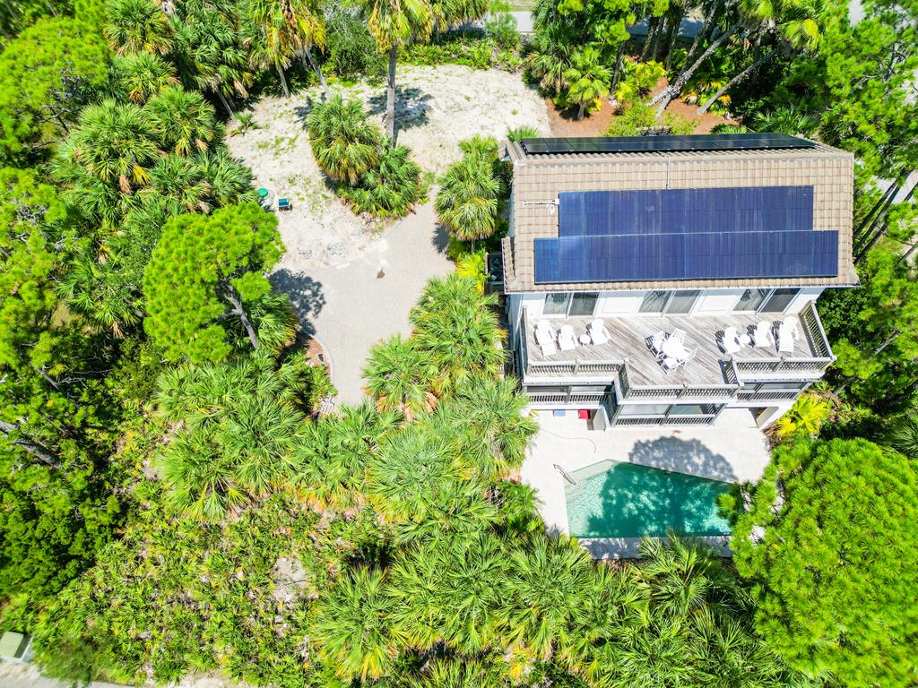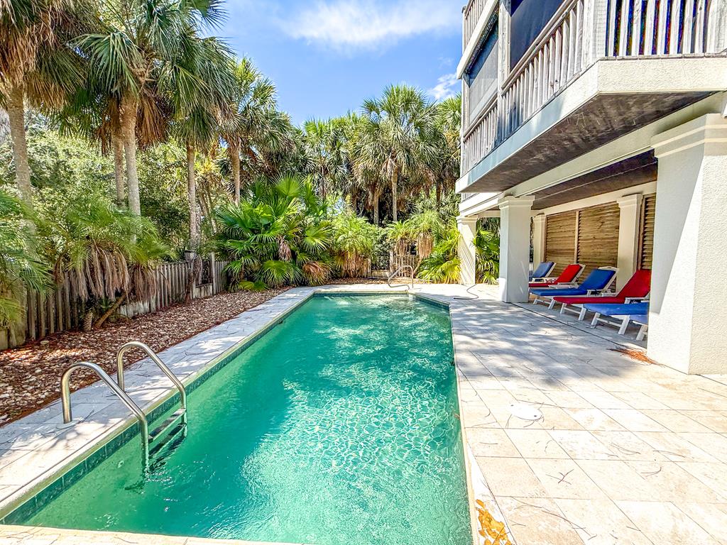 Welcome to island living at its finest. This beautifully renovated and fully furnished 5-bedroom, 4.5-bath Mediterranean retreat is tucked inside the gated community of St. George Island Plantation, just a short stroll from the sugar-white sand and emerald Gulf waters. With room to sleep 14, the home offers two spacious living areas perfect for gathering after long beach days, an open top-floor deck made for sunset skies, and a screened porch where you can relax and catch the coastal breeze. Inside, light-filled spaces blend comfort and coastal sophistication. Refinished hardwood floors, granite countertops, modern fixtures, updated hardware, polished metal railings, and refreshed bathroom lighting create a clean, elevated look that still feels relaxed and inviting. The kitchen and living areas flow effortlessly for entertaining family and friends. Thoughtful upgrades bring both efficiency and peace of mind. Solar panels installed in 2023 power the entire home—including the electric water heater—leaving only a minimal $30 monthly connection fee. A new large-capacity water heater and a brand-new aerobic septic system were also added, while hurricane shutters provide added protection and potential insurance savings. Step outside to your private pool, complete with a heater/chiller system for year-round enjoyment. New aluminum safety gates, a golf cart garage, and generous storage make beach days simple and stress-free. Located just 1,000 feet from the shoreline, owners enjoy all the amenities of St. George Island Plantation, including 24-hour gated security, two community pools, clubhouse, fitness center, tennis and pickleball courts, scenic bike paths, and even a 3,300-foot private airstrip. With strong rental history and impressive projections, this home offers the perfect blend of coastal comfort and income potential. Schedule your private showing today and start living the island life. New buyer fee of % to the Plantation Owner's Association.